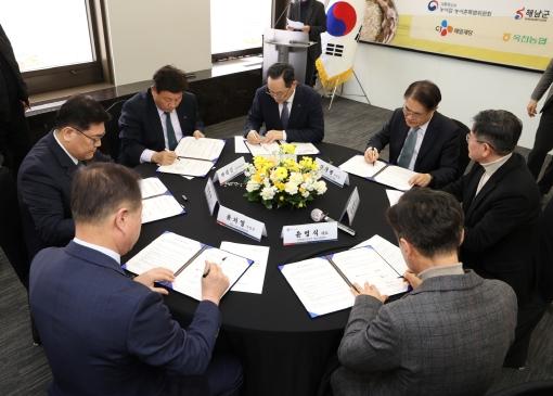 농어업·농어촌특별위원회 버텍스홀에서 열린 업무협약에는 명현관 해남군수를 비롯해 농어업·농어촌특별위원회 장태평 위원장, 한국농어촌공사 박태선 기반조성이사, CJ제일제당 임형찬 부사장, 옥천농협 윤치영 조합장, 땅끝황토친환경영농조합법인 윤영식 대표이사가 참석했다.