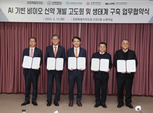 강원특별자치도는 3. 12 도청에서 인제대학교, 인제대학교 백병원, 세종대학교, (재)스크립스코리아항체연구원과 함께 업무협약을 체결했다.