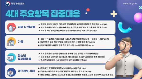 소비자 피해 우려가 큰 4대 주요항목에 대해서는 부처간 공동 대응도 이루어질 예정이다. 식품의약품안전처는 위해 식·의약품 관련 불법유통·부당광고에 대응하기 위해 해외 온라인 플랫폼에 대한 광고 차단 요청, 특별점검 등 관리를 강화할 예정이다.