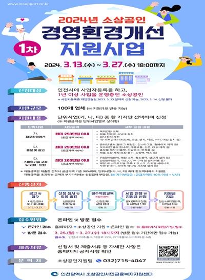 인천시가 지역 소상공인들의 경영안정과 자생력 강화를 위해 ‘2024년 1차 소상공인 경영환경개선사업’을 추진한다.