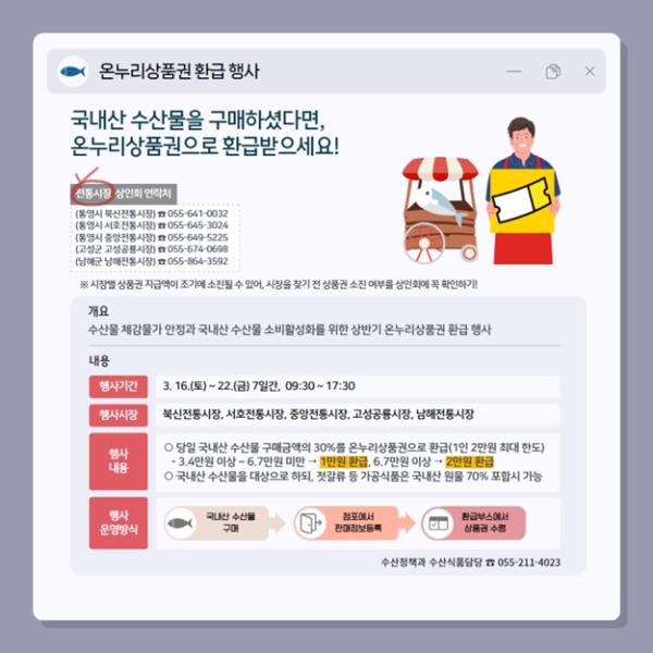 경상남도는 3월 16일부터 22일까지 7일간 북신전통시장, 서호전통시장, 중앙전통시장, 고성공룡시장, 남해전통시장에서 국내산 수산물 구매금액의 최대 30%를 1인 최대 2만 원까지 온누리상품권으로 환급하는 부스 행사를 추진한다고 밝혔다.