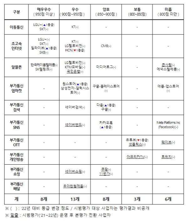 또한 부가통신 검색·소셜네트워크서비스(SNS) 분야에서 ▲네이버㈜(검색)는 우수 등급으로 전년과 동일한 등급을 받았고, ▲㈜카카오(다음, 카카오톡)는 2개 서비스 모두 양호 등급을 받아 전년보다 1등급 상향됐다.