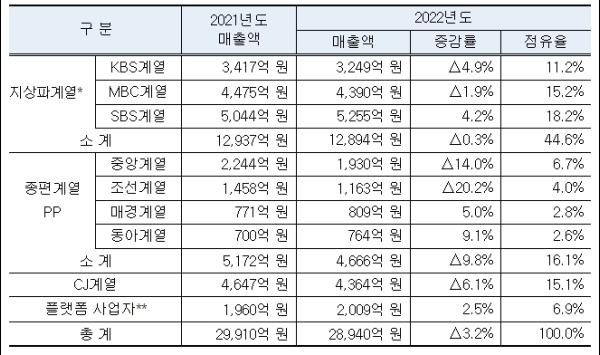 2022년도 방송광고시장은 전년(2조 9,910억 원) 대비 3.2% 감소한 2조 8,940억 원으로 조사됐고, 협찬매출액은 8,446억 원으로 전년(8,377억 원) 대비 소폭(0.8%) 증가했다.