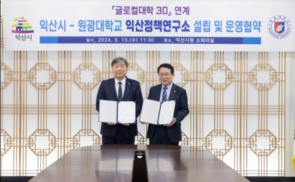 익산시는 원광대학교와 13일 익산시청 소회의실에서 원광대학교 지역혁신연구원 내 익산정책연구소 설립 및 운영 활성화를 위한 업무 협약을 체결했다.
