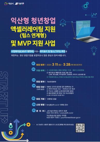 이번 사업은 익산청년시청과 ㈜전북지역대학연합기술지주회사가 협업해 진행하며, 중소벤처기업부 민간투자주도형 기술창업지원 프로그램인 '팁스'(TIPS) 연계형 사업으로 창업기업의 안정적인 성장에 도움이 될 것으로 기대된다.