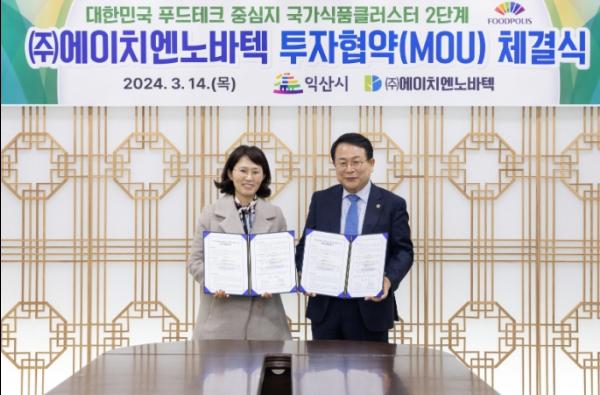 시는 14일 정헌율 익산시장과 김양희 ㈜에이치엔노바텍 대표이사가 참석한 가운데 국가식품클러스터 2단계 투자협약을 체결했다.