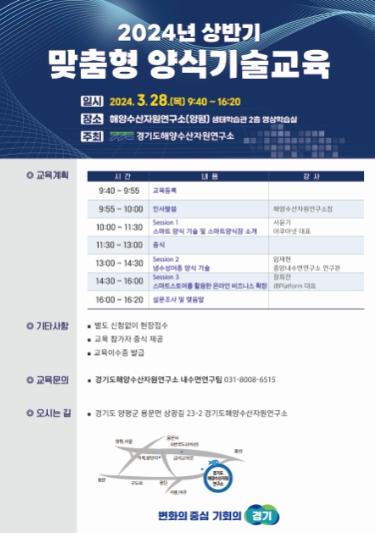 경기도해양수산자원연구소가 28일 양평에 위치한 연구소 생태학습관에서 내수면 양식어업인의 경쟁력 강화를 위한 상반기 맞춤형 양식기술교육을 실시한다.
