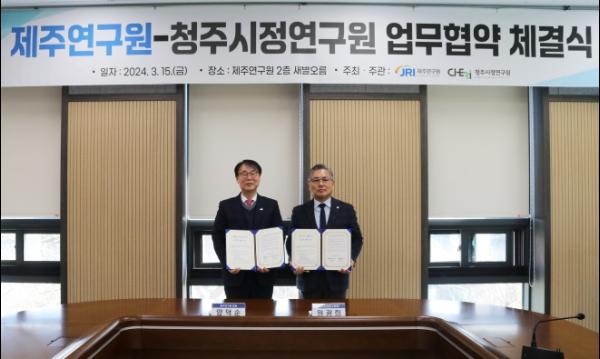 청주시정연구원은 15일 제주연구원 새별오름 대회의실에서 제주연구원과 지방연구원 간 연구 협력 체계 구축을 위한 업무협약을 체결했다.