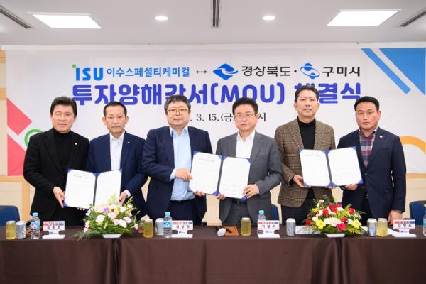 구미시는 15일 시청에서 이철우 경북도지사와 김장호 구미시장, 김상범 이수그룹 회장, 류승호 이수스페셜티케미컬 대표 등이 참석한 가운데 구미국가산업단지 내 공장 신설을 위한 투자양해각서(MOU)를 체결했다.