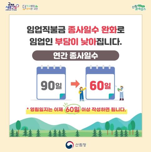 그간 임업분야는 고령자의 비중이 높아 산림경영일지 작성 시 종사일 수 90일을 증명하는 데 어려움이 있었으나, 이번 개정을 통해 올해부터 산림경영 종사일 수가 (기존) 90일에서 → (변경) 60일 이상으로 하향 조정되면서 임업직불금 신청 부담이 30% 이상 경감될 것으로 기대하고 있다.