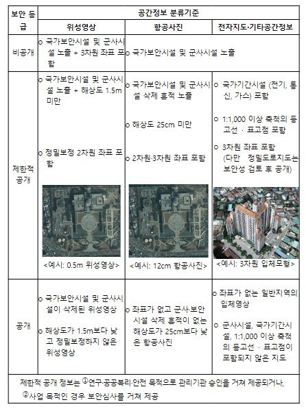 그동안 매우 정밀하거나 좌표가 포함되어 안보상의 이유로 공개가 제한된 공간정보는 공간정보사업자와 위치정보사업자에 한하여 제공해 왔다.