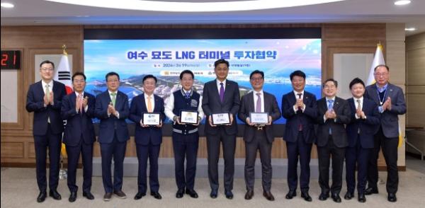 여수시가 19일 전남도청 서재필실에서 전남도와 ㈜한양, GS에너지(주)와 민관 공동으로 1조 4천억 원을 투자하는 ‘묘도 LNG 터미널 사업’ 추진을 위한 협약을 체결했다.