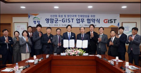 영암군이 19일 군청에서 광주과학기술원(GIST, 총장 임기철)과 ‘미래과학기술 인재 양성 및 지역 신산업 육성 업무협약’을 체결했다.