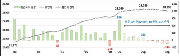 동 기간(2022년~2032년) 취업자 수는 30.9만명 증가하겠으며, 2027년까지는 증가를 지속하다가 2028년부터는 공급제약의 영향을 받아 감소 전환할 것으로 전망했다.