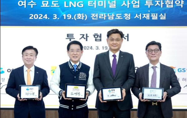 전라남도는 19일 도청 서재필실에서 ㈜한양, GS에너지㈜, 여수시와 함께 여수 묘도 액화천연가스(LNG) 터미널 사업 투자협약을 하고, 터미널 사업의 성공과 지역경제 활성화를 위해 힘을 모으기로 했다.
