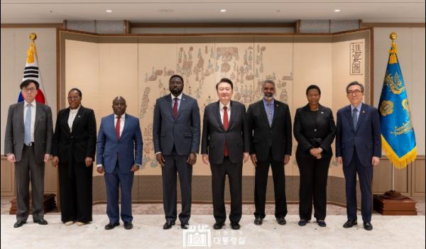 윤석열 대통령은 3월 19일 오후 대통령실에서 제3차 민주주의 정상회의 1일 차 장관급회의 참석차 방한한 아프리카 5개국 장·차관급 인사들을 접견했다.