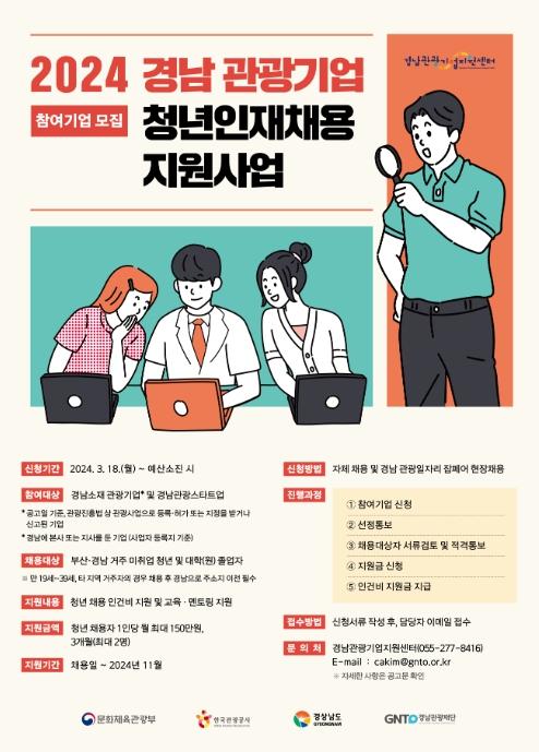 지원대상은 신청일 기준 경남에 주소를 둔 관광사업체 또는 경남관광기업지원센터에 입주한 관광스타트업이다. 해당 기업에서 만 39세 이하의 도내 청년을 채용 시 3개월간 월 150만 원씩 인건비를 최대 2명 지원하며, 경영·노무 컨설팅도 제공된다. 청년들은 관광 트렌드와 실무 역량을 향상할 수 있는 교육을 받을 수 있다.