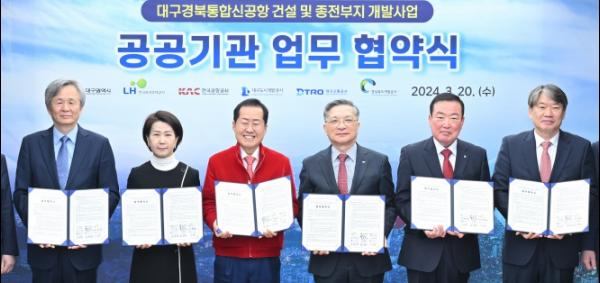 대구광역시는 3월 20일 오전 10시 대구광역시 산격청사에서 한국토지주택공사, 한국공항공사, 대구도시개발공사, 대구교통공사, 경상북도개발공사와 '대구경북신공항 건설 및 종전부지 개발사업'의 성공적 추진을 지원하기 위한 업무협약을 체결했다.