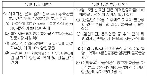 ① 납품단가 지원 관련, 3월 18일부터 지원품목을 기존 13개에서 21개로 확대하고, 지원단가도 품목별로 최대 2배까지 확대 적용하고 있다. 농산물 납품단가 지원으로 유통업체의 판매 정상가격이 낮아져 소비자의 물가 불안심리를 낮추는 효과가 있으며, 유통업체 자체할인과 정부 할인지원 30%까지 더해질 경우 소비자 물가 부담이 더욱 완화되는 효과가 발생할 것으로 기대된다.