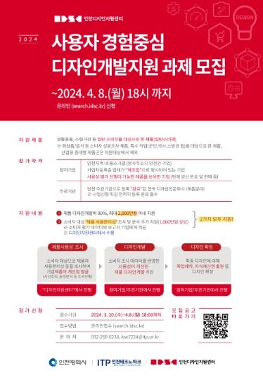 인천테크노파크(인천TP)는 소비자 선호도가 높은 제품디자인을 개발하기 위한 ‘사용자 경험 중심 디자인 개발’ 지원과제를 다음 달 8일까지 모집한다고 밝혔다.