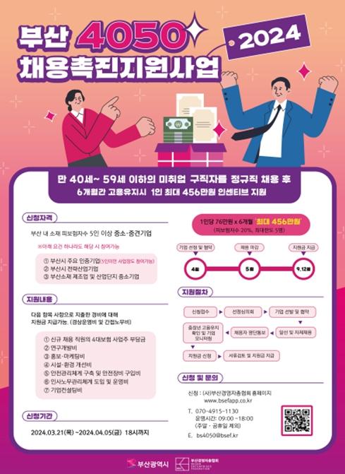 신창호 시 디지털경제혁신실장은 “이번 사업은 부산 경제의 허리층인 40?50대를 위한 양질의 일자리창출과 고용안정을 위한 것”이라며, “부산 중소·중견기업의 많은 관심과 참여를 부탁드리며, 우리시는 앞으로도 40?50대의 일자리 창출을 위한 다양한 시책을 펼쳐 나갈 것”이라고 밝혔다.