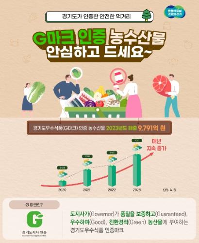 경기도는 도지사가 인증하는 경기도 농산물브랜드 G마크 매출액이 2021년 9,000억 원, 2022년 9,465억 원에서 지난해 9,791억 원으로 코로나19 발생 이전 수준까지 회복했다고 21일 밝혔다.