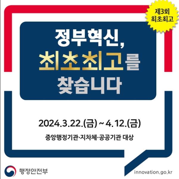 행정안전부는 한국행정연구원과 함께 오는 4월 12일까지 중앙·지방 행정기관 및 공공기관을 대상으로 공모를 통해 제3회 ‘정부혁신 최초?최고’ 선정을 추진한다.