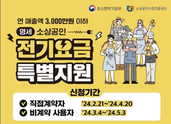 사업 지원 대상은 2023년 이전 개업해 현재 사업을 운영 중인 부가세 신고 매출액 3천만 원 이하 사업자다. 전기요금 계약 형태 중 지원사업 대상은 ▲일반용 ▲산업용 ▲농사용 ▲교육용 혹은 ▲주택용 중 비주거용 전기요금을 부담하는 사업자다.