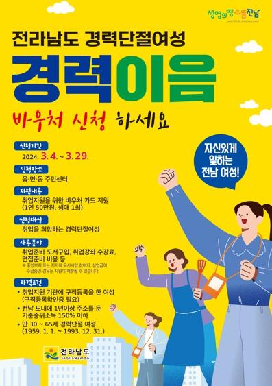 전라남도는 출산과 육아 등으로 직장을 그만둔 후 재취업에 어려움을 겪는 경력 단절 여성에게 구직에 필요한 취업·면접 준비 비용을 지원하는 ‘경력이음바우처’ 이용자를 오는 29일까지 모집한다고 밝혔다.
