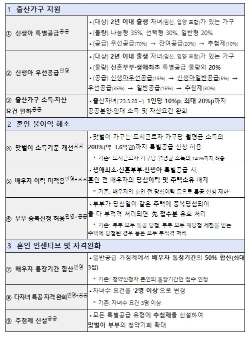 지난해 합계출산율은 0.72명으로 역대 최저를 기록, 국가 소멸 위기감이 고조되고 있다. 이에, 국토교통부는 주택 청약 시 결혼 페널티를 없애고, 출산 가구가 더 많은 내 집 마련 기회를 가질 수 있도록 청약 제도를 개선했다. 세부 내용은 아래와 같다.