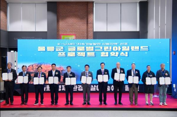 울릉군은 3월 25일 한동대학교 창조도서관에서 경북도와 한동대학교, 울릉고등학교 및 7개 기업 관계자들과 함께 K-U시티 사업의 실효성 있는 추진 및 적극적 상호협력을 위한 ‘울릉군 글로벌그린 아일랜드 프로젝트’ 업무협약을 체결했다.