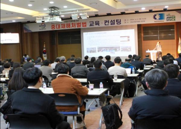 성남산업진흥원과 성남상공회의소의 공동주관으로 중대재해처벌법 확대 시행에 따른 중대재해 예방교육을 3월 21일 성남산업진흥원 대강당에서 실시했으며, 중소, 벤처기업 임직원 130명이 참석했다.