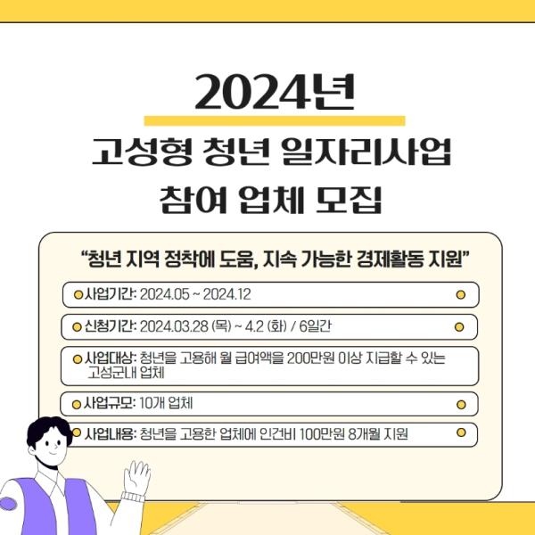 군은 오는 3월 28일부터 4월 2일까지 6일간 ‘2024년 고성형 청년 일자리 사업’ 참여 업체를 모집한다고 밝혔다.