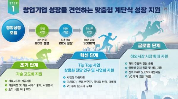 창업기업을 초기, 혁신, 글로벌 단계로 구분하고 성장 단계별 계단식 지원프로그램을 운영한다.