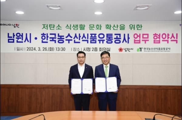 남원시와 aT는 3월 26일 남원시청에서 먹거리 생산부터 소비까지 저탄소 식생활 확대 및 저탄소 농법을 통한 친환경 농수축산물 생산으로 국내 유통 활성화와 수출 확대를 위한 업무협약을 체결했다.