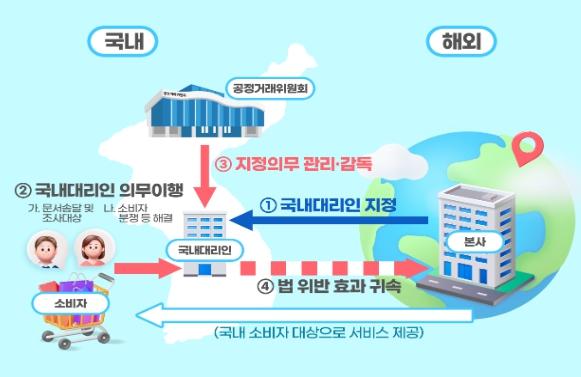 이에 따라, 앞으로는 국내에 주소·영업소가 없는 해외 사업자라 하더라도 매출액, 이용자 수 등 일정 기준을 넘는 경우 소비자 보호 의무를 강화하기 위해 국내대리인을 지정토록 의무화할 예정이다. 국내대리인은 기본적으로 법 위반 행위의 조사와 관련된 자료·물건의 제출 주체 및 문서 송달의 대상이 되며, 소비자 불만 및 분쟁 등과 관련하여 사업자가 통신판매업자인지 통신판매중개자인지에 따라 전자상거래법에서 부과하는 소비자 보호 의무를 각각 이행하게 된다.