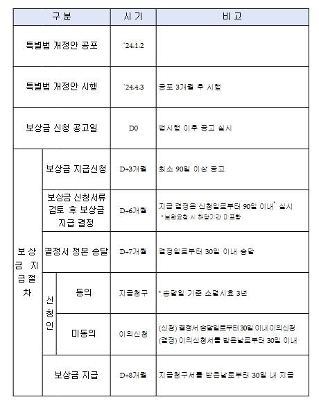 올해 4월 3일부터 ?내수면가두리양식업보상법? 및 동법 시행령 개정안이 시행되면, 해양수산부는 보상대상자가 누락되지 않도록 어업인 현장 설명회 등을 통해 보상신청을 적극 안내할 예정이다. 이후 손실보상금 신청공고를 시작으로 보상금 지급 절차를 개시한다.
