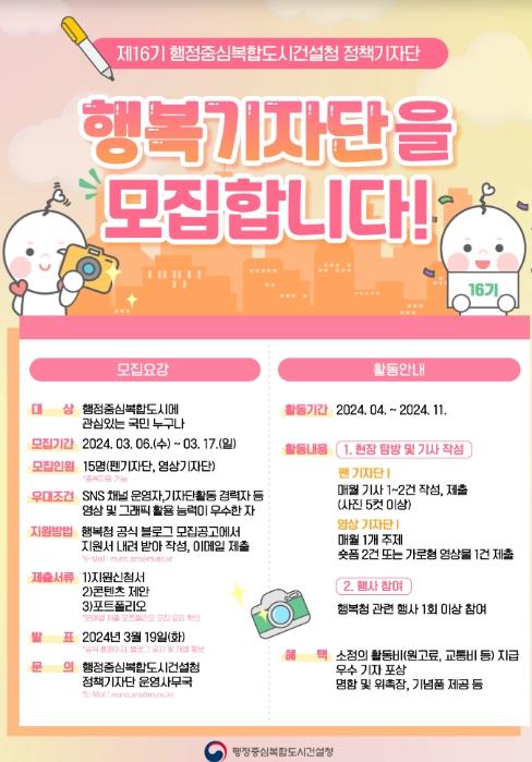 행복청은 행복도시 건설사업을 젊고 참신한 시각으로 알리기 위해 ‘행복기자단’을 이달 17일까지 모집한다.