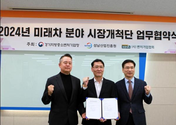 성남산업진흥원은 경기지방중소벤처기업청, 벤처기업협회와 미래차분야 시장개척단 업무협약을 체결했다고 26일 밝혔다