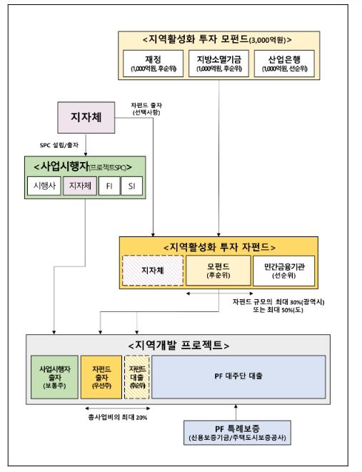 정부재정, 지방소멸대응기금, 산업은행에서 각각 1,000억원씩 출자하여 3,000억원 규모 모(母)펀드를 조성하고, 지자체?민간이 함께 자(子)펀드 결성과 프로젝트 특수목적법인(SPC) 설립을 통해 총 3조원 규모의 다양한 지역활성화 프로젝트에 투자한다.