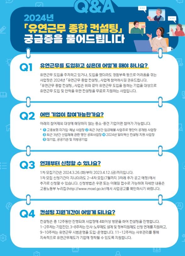 고용노동부(장관 이정식)는 기존의 “재택근무 컨설팅”을 올해부터 “유연근무 종합 컨설팅”으로 기능을 확대하고, 3.26.(화)부터 컨설팅을 원하는 중소·중견기업의 신청을 받는다고 밝혔다.