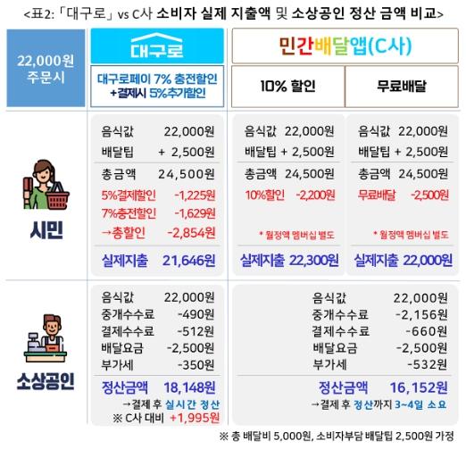 대구광역시가 위와 같은 C사의 정책을 소비자와 소상공인 양측 면에서 ‘대구로’와 비교한 결과, 2만 2천 원 음식을 ‘대구로’에서 주문할 경우 소비자는 C사 대비 소폭 저렴한 금액으로 주문할 수 있으며 소상공인은 C사 대비 주문 1건당 약 2,000원(C사 정산 금액의 12.4%)의 비용을 절감할 수 있다.
