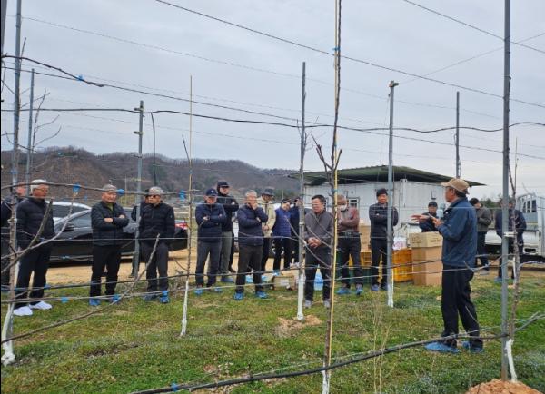 현장 교육 내용은 신양면 이승호 농가에서 △2D 수형 전정 및 가지 유인 방법 △신초 발생을 위한 아상(눈에 상처를 내는 일)처리 및 발아촉진제 도포 방법 등이, 삽교읍 이인호 농가에서는 △다축과원 지주 및 와이어 설치 등 과원조성 교육 △품종별 다축(구요) 묘목식재 거리 및 실습 △가지 발생 교육이 각각 진행돼 참여 농업인에게 큰 호응을 얻었다.