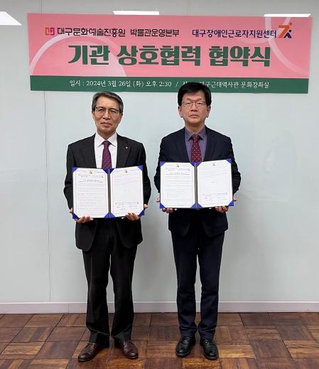 (재)대구문화예술진흥원 박물관운영본부는 대구장애인근로자지원센터와 장애인 권익보호 및 기관 상호발전을 위한 업무협약을 3월 26일에 대구근대역사관에서 체결했다.
