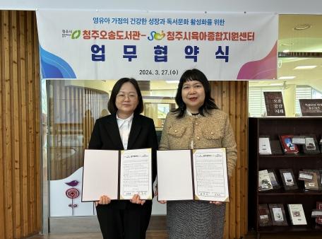 청주오송도서관은 청주지역 영유아 가정의 건강한 성장을 지원하고 독서문화를 활성화하기 위해 27일 오송도서관에서 청주시육아종합지원세터와 업무협약을 체결했다.