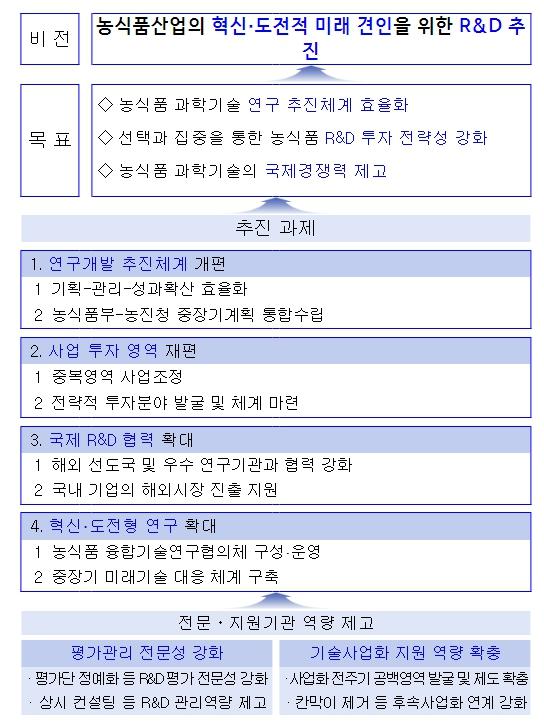 첫째, 연구개발 추진체계를 개편한다. 농식품부와 농촌진흥청이 연구개발사업을 함께 기획하고, 사업관리는 농림식품기술기획평가원, 성과확산은 한국농업기술진흥원 중심으로 개편하여 기획-관리-성과확산 체계를 효율화한다. 또한 각기 추진하던 농식품부와 농진청의 중장기계획을 통합하여 수립한다.