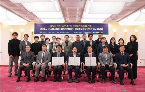 남양주시는 27일 시청 여유당에서 한국폴리텍Ⅲ대학 춘천캠퍼스(학장 이덕수) 및 경기동부상공회의소(회장 문한경)와 함께 현장 실무중심의 지역 맞춤 인력 양성을 위해 업무협약을 체결했다고 밝혔다.