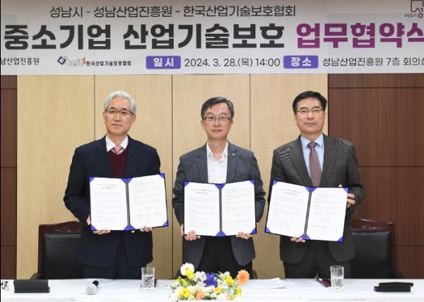 성남시가 28일 성남시 중소기업의 기술 유출 예방과 보호 체계 강화를 위해 한국산업기술보호협회, 성남산업진흥원과 ‘성남시 중소기업 산업기술보호 협력체계 구축’을 위한 업무협약을 체결했다.