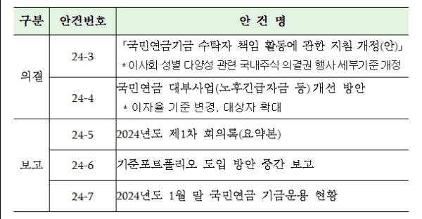 국민연금기금운용위원회는 3월 28일에 2024년도 제2차 회의를 열어 ‘국민연금기금 수탁자 책임 활동에 관한 지침 개정(안)’과 ‘국민연금 대부사업(노후긴급자금 등) 개선 방안’을 심의·의결하고, ‘국민연금기금 기준포트폴리오 도입 방안’ 등을 논의했다.