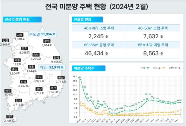 (미분양) 2월말 기준 미분양 주택은 총 64,874호로, 전월(63,755호) 대비 1.8%(1,119호) 증가했다. 준공 후 미분양은 11,867호로 전월(11,363호) 대비 4.4%(504호) 증가했다.